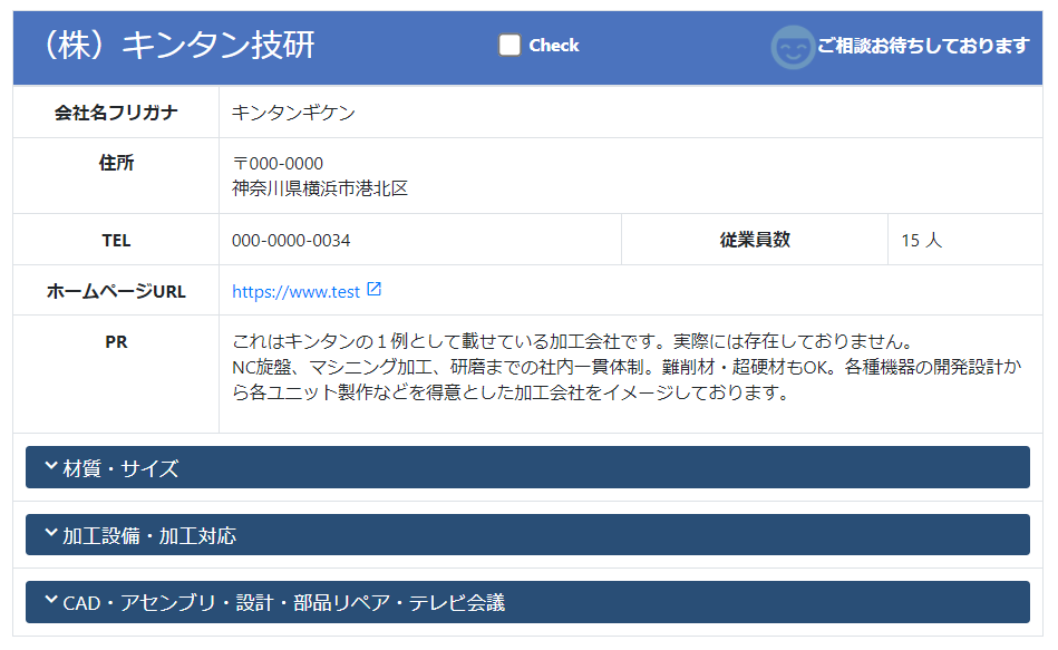 以下は検索ヒットした際の加工会社ご紹介画面です。